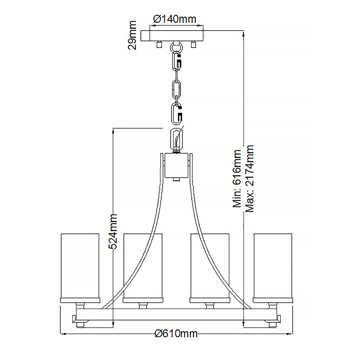 6 ламп - мин. длина - 89.8 см, макс. длина - 224.3 см. Ш77.2 х Г77.2 х В59.4 см (Вес 10.8 кг)