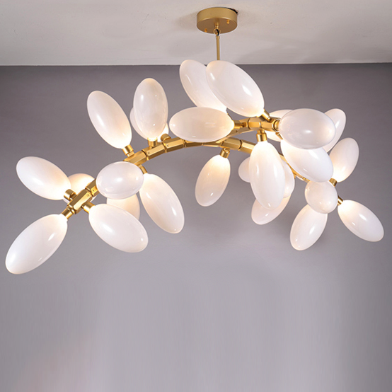 Каждая люстра состоит из большого количества плафонов нанизанных на алюминиевые подвижные позвонки. Что дает возможность видоизменять люстру, давать ей естественное ниспадание. Каждый плафон выдувается вручную - что дает особенное, в полном смысле этого слова, неповторимое, изящество.